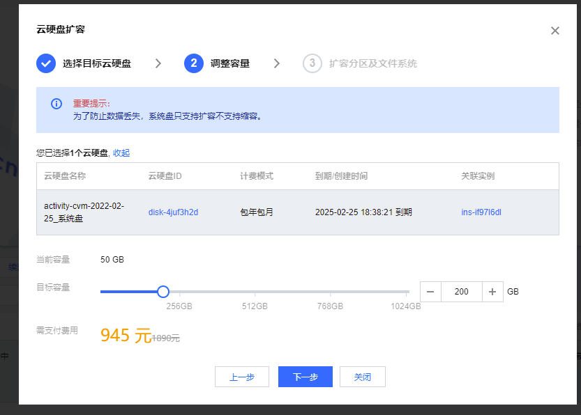 选择需要扩容的盘,选择好扩容容量,点击下一步,确认并购买