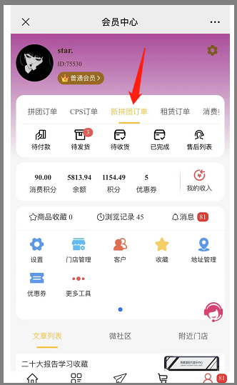 1, 会员中心,订单处显示新拼团订单