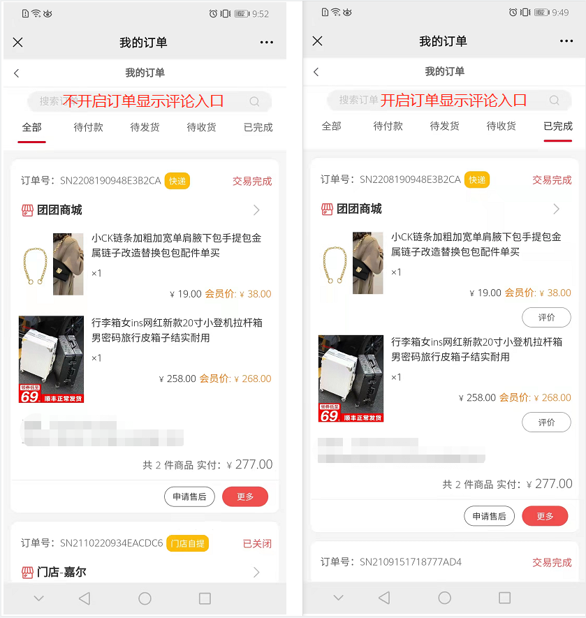 若不开启,订单列表不再显示评价入口,只能通过个人中心--评论进行评价,效果图如下.