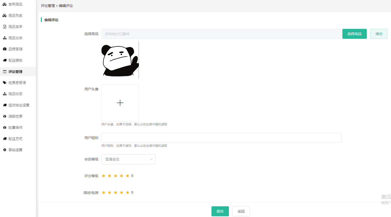 4、可以后台添加商品虚拟评价信息:用户头像、用户昵称、评分等级、首次评价等。