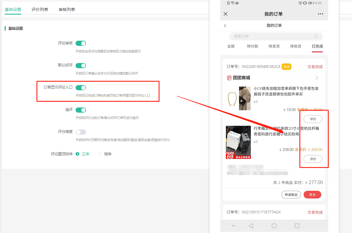 开启后已完成订单的列表页和订单详情页显示评论入口。