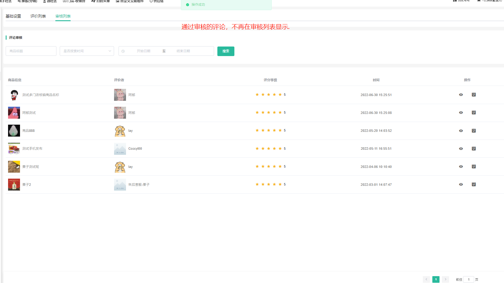 支持查看会员商品评价、是否通过审核、是否显示、是否置顶。