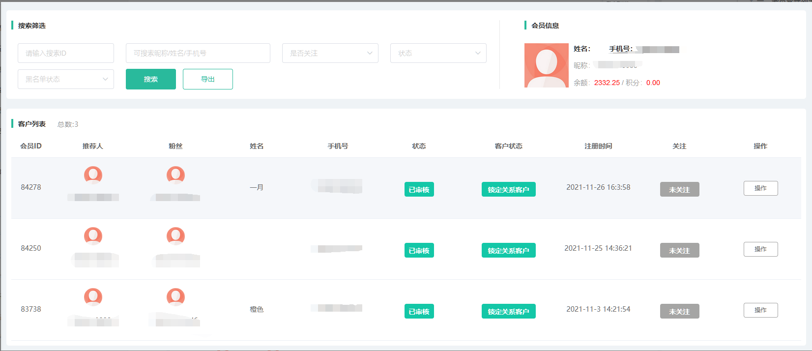 直推客户:搜索会员id,昵称/名称/手机号,页面查看会员关注、状态(会员前端申请推广员的审核状态)和黑名单状态和导出表格