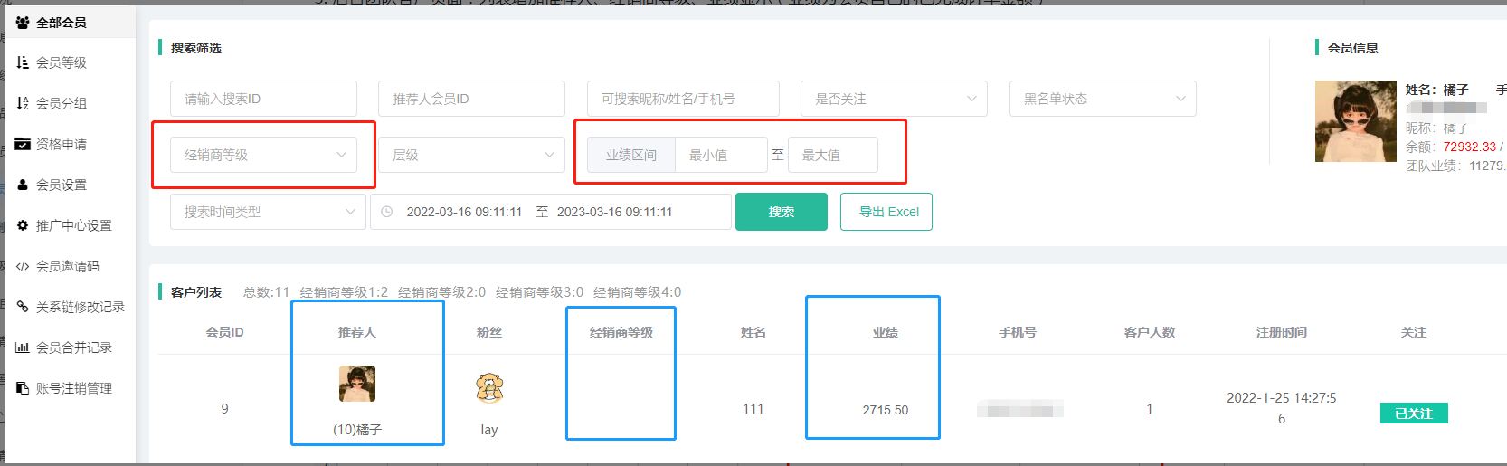 3. 后台团队客户页面:列表增加推荐人、经销商等级、业绩显示(业绩为会员自己的已完成订单金额)