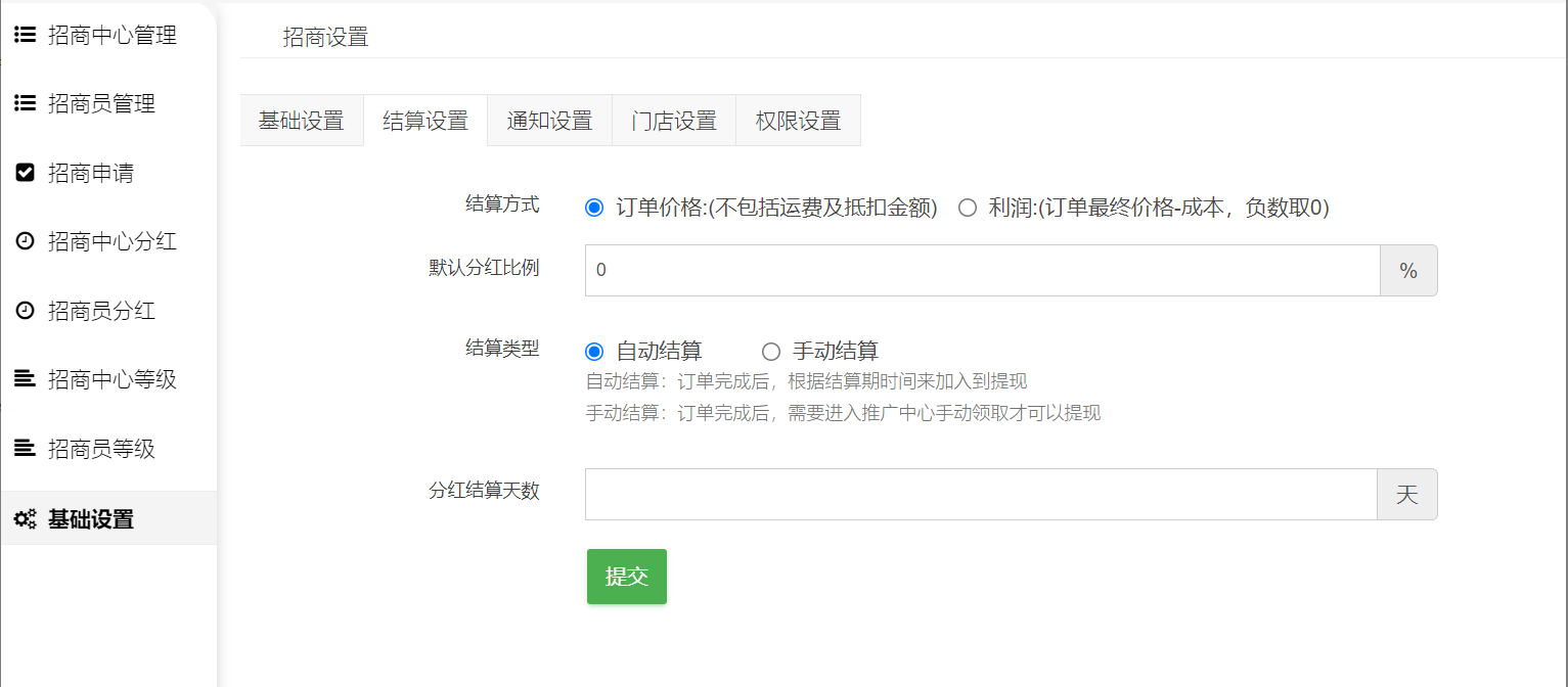 3.结算天数:订单完成,满足结算天数后,招商员、招商中心才可以结算招商分红。0天:订单确认收货后当天会进入结算期。1天:则订单确认收货1天后才进行结算期,招商员才能进行提现。