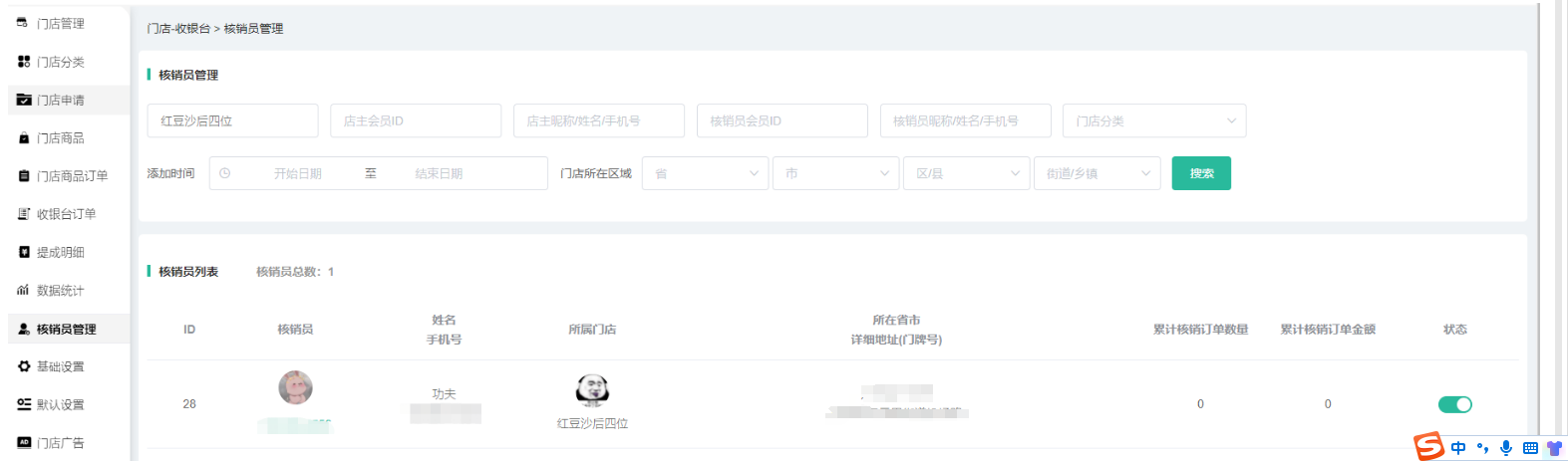 门店--核销员,可以搜索核销员昵称/姓名/手机号,所属门店,和状态