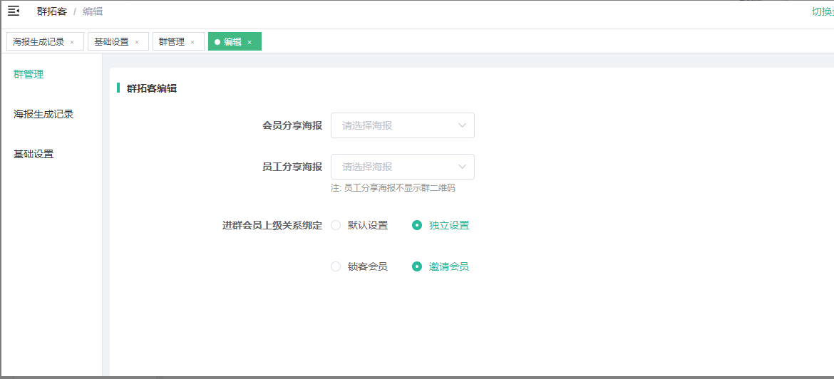 1)会员、员工分享海报:群单独设置了会员、员工分享海报,按照独立设置;群没有设置海报则按照基础设置走