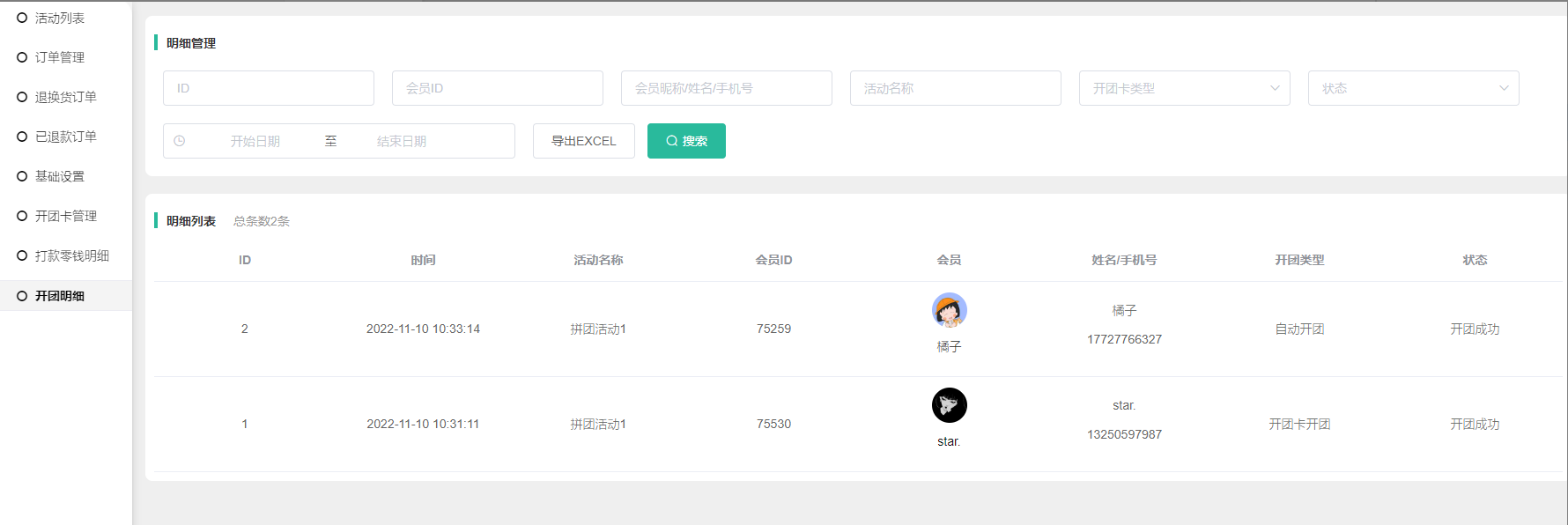 1, 参团会员成团自动开团、开团卡开团的明细