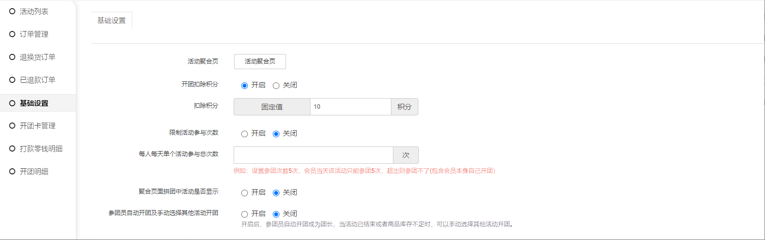 3, 聚合页面拼团中活动是否显示:开启后前端聚合页面,活动列表会显示正在拼团中的拼团