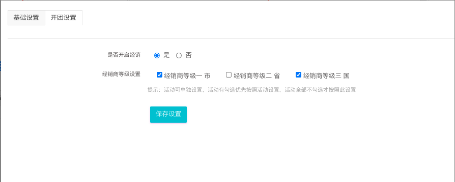 14) 经销商设置:全部不勾选则按照基础设置;只勾选一个其他不勾选,则没勾选的经销商不能开团;勾选了的可设置总开团次数,设置为0则不限制次数