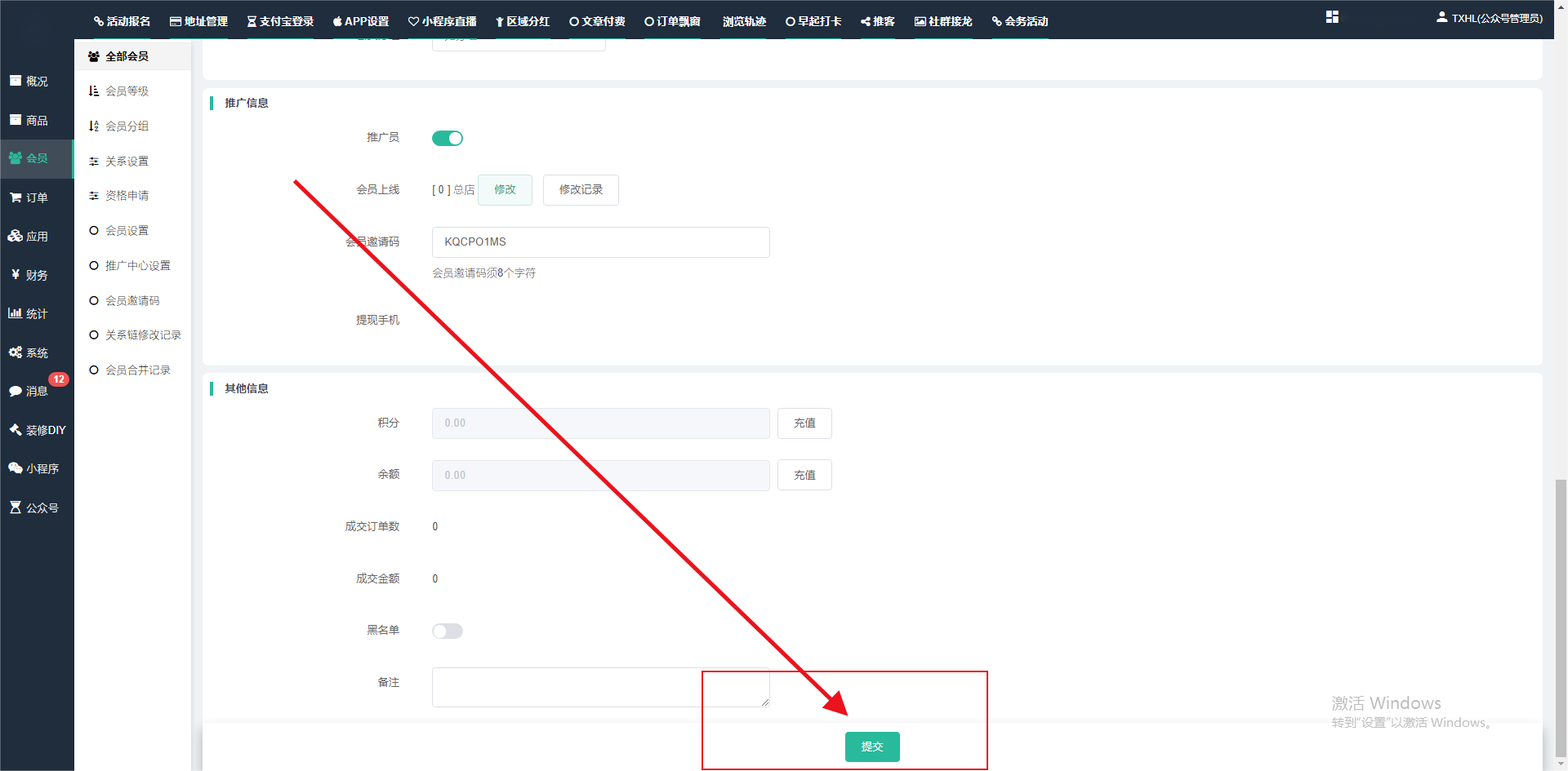 目录 搜索 展开 一、前期准备资料二、数字乡村码-上线操作指南1、服务号的申请流程及认证2、申请小程序流程3、开放平台绑定小程序和公众号三、数字乡村码-系统操作数字乡村码系统管理-概况数字乡村码-商品管理1、发布商品2、商品列表3、商品表单4、商品分类5、品牌管理6、配送模板7、评论管理8、优惠券管理9、商品标签10、退货地址设置11、满额优惠12、批量操作13、配送方式14、基础设置15、商品隐藏四、数字乡村码-会员管理1、全部会员2、会员等级3、会员分组4、资格申请5、会员设置6、推广中心设置7、会员邀请码8、会员关系链修改关系链修改记录9、会员合并记录10、账号注销管理11、会员设置中心五、数字乡村码-订单管理1、订单管理列表2、订单处理流程3、订单状态4、订单修改价格5、订单退款退货6、多包裹发货7、批量发货订单操作步骤8、催发货订单9、物流查询六、数字乡村码-财务管理1、余额设置2、会员余额3、充值记录4、转让记录5、余额明细6、收入明细7、提现设置8、提现统计9、积分管理10、转账审核11、收益广告12、批量充值七、数字乡村码-系统管理1、商城入口2、商城设置①、商城设置②、订单设置③、物流查询④、短信⑤、联系方式⑥、分类⑦、优惠券⑧、分享⑨、幻灯片⑩、广告位⑫、地图设置3、交易设置4、微信模板消息自定义消息模板(新版)自定义消息模板(旧版)小程序消息模板公众号模板消息变更公告5、语言设置6、权限管理7、多媒体管理八、数字乡村码-消息管理九、数字乡村码-应用管理十、数字乡村码系统-数据统计十一、数字乡村码-页面装修DIY1、模板管理2、店铺页面3、顶部导航4、底部导航5、DIY模板市场6、首屏广告7、基础设置8、装修DIY尺寸建议十二、供应商功能插件操作指南1、供应商2、门店-收银台门店申请和使用步骤门店管理①、门店-收银台 营销设置②、门店-收银台 分润设置门店分类门店申请门店审核门店商品门店商品订单收银台订单数据统计核销员基础设置默认设置门店装修3、微社区4、会务活动十三、营销插件操作指南活动报名提货卡新人奖微店问卷调查积分视频分享1、视频分享基础设置2、视频分享发现管理3、视频分享分类管理4、视频分享评论管理5、视频分享分红记录6、视频分享短视频中心每日红包幸运大抽奖签到优惠券二维码任务奖励优惠劵文章音频文章付费文章限时购新海报拓客卡操作流程积分活动素材中心视频红包十四、入驻门店应用类1、门店预约2、附近商品3、门店定位设置4、门店控制5、门店满额包邮6、门店满额减7、导入商品8、门店搜索9、门店股东10、核销券11、多门店核销1、商城后台设置2、前端功能演示十五、常见问题1、后台登录密码修改流程2、会员-余额,积分,后台如何进行充值与扣除3、如何修改上下级关系4、一种万能的获取商城小程序路径的方法 暂无相关搜索结果! 阅读次数:1799 本文档使用 模王系统 发布 3、如何修改上下级关系 如何修改上下级关系一.如何修改上下级关系?1.会员-全部会员-可以通过搜索用户的独立ID,或者用户微信昵称,找到此会员,然后点击右边的(操作)2.再点击会员详情。3.滑到下面,有个推广信息-会员上线,点击修改4.输入上级的ID号,点击搜索,出来此上级会员后点击选择。5.滑到最下面,一定要点击提交按钮。文档更新时间: 2024-01-05 14:50 作者:链上旅行