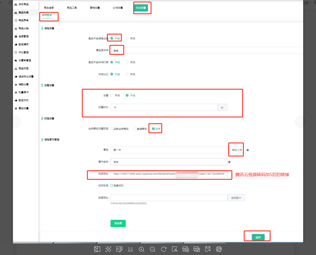 4.2选择行业设置-课程设置-开启课程点播-设置讲师-输入腾讯云转码链接加S后的链接,保存。