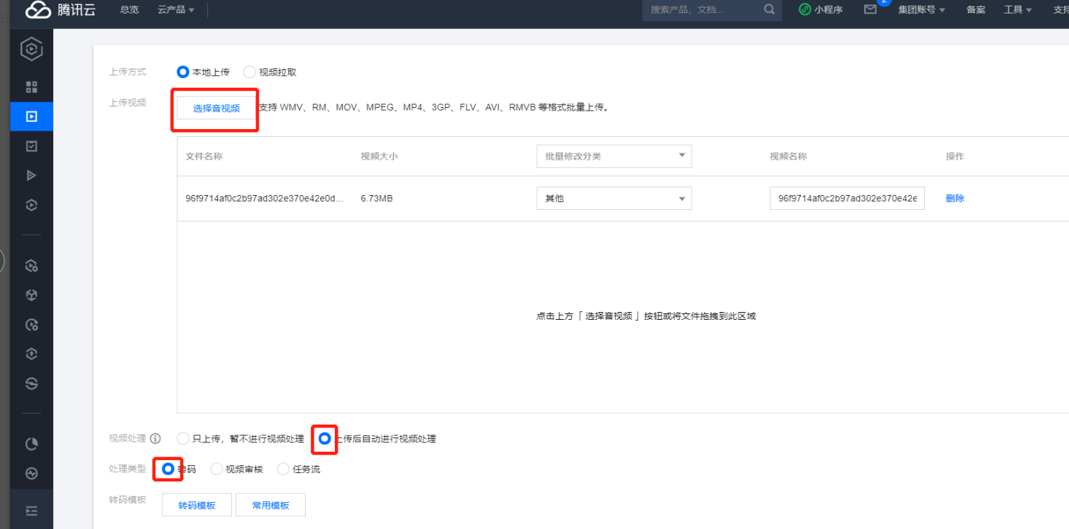 注意细节1:视频处理-选择上传自动进行视频处理-处理类型-选择转码